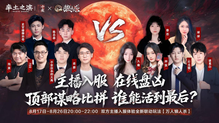 为了将这场“心理战”推向高潮,《率土之滨》与《狼人杀》还将邀请双方的顶级主播和人气解说亲自下场,空降联动主题服,参与这场万人身份博弈。