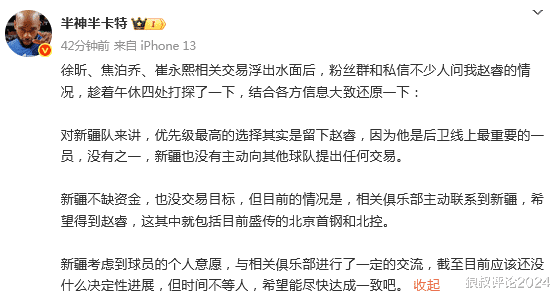 媒体人“半神半卡特”最新报道,对新疆队来讲,优先级最高的选择其实是留下赵睿,因为他是后卫线上最重要的一员,没有之一,新疆也没有主动向其他球队提出任何交易。